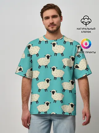 Мужская футболка оверсайз / Овечки паттерн на бирюзовом