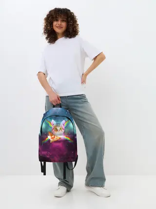Рюкзак джинсовый / Кот с радугой и пиццей