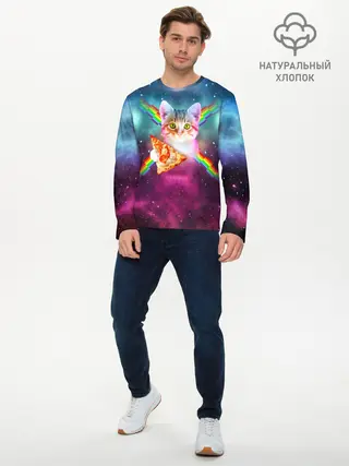 Мужской лонгслив базовый / Кот с радугой и пиццей