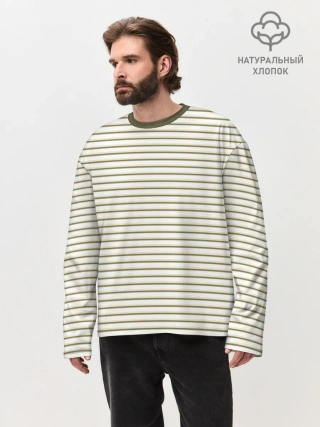 Мужской лонгслив оверсайз хлопок / Зелёная приглушённая полоска
