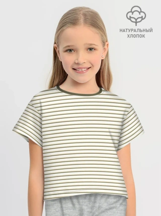 Футболка для девочки укороченная оверсайз хлопок / Зелёная приглушённая полоска