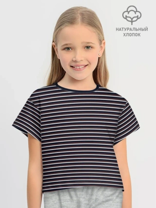 Футболка для девочки укороченная оверсайз хлопок / Тёмно-синяя полоска