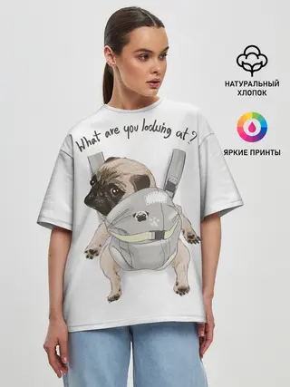 Женская футболка оверсайз / Мопс в рюкзаке
