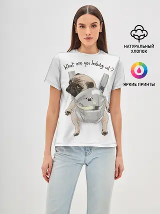 Женская базовая футболка / Мопс в рюкзаке