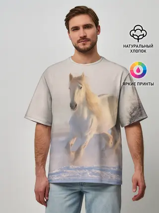 Мужская футболка оверсайз / Белая лошадь на снегу