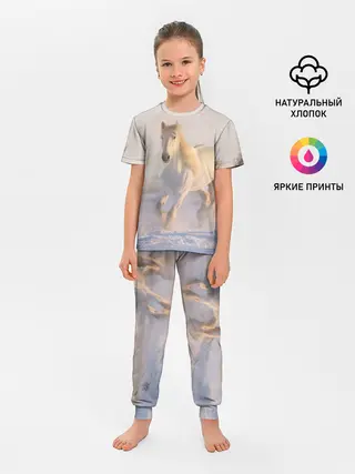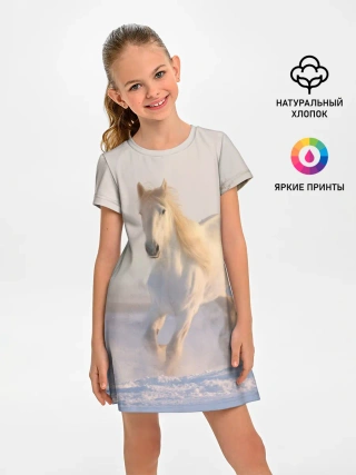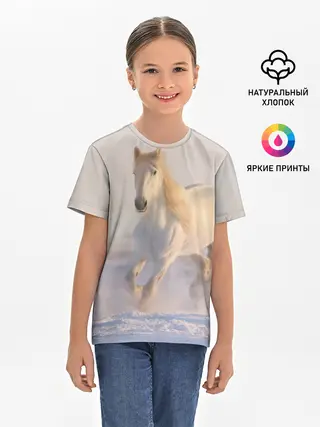Лонгслив женский. Хлопок / Белая лошадь на снегу
