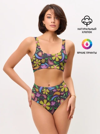 Женские топ и трусы / летние цветы узор на темном