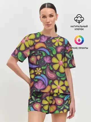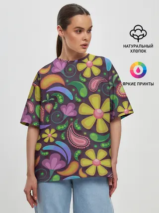 Женская футболка оверсайз / летние цветы узор на темном