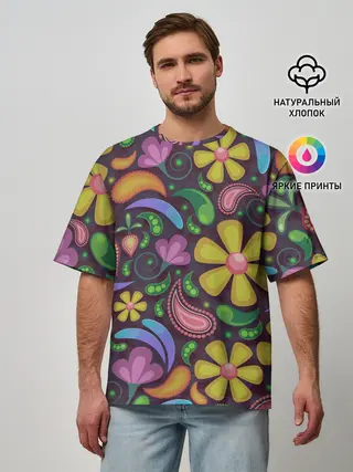 Мужская футболка оверсайз / летние цветы узор на темном