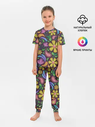 Детская пижама с брюками / летние цветы узор на темном