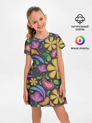 Детское платье / летние цветы узор на темном