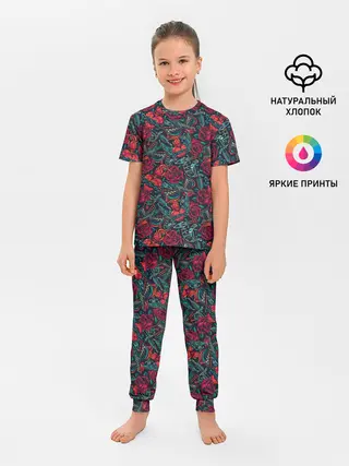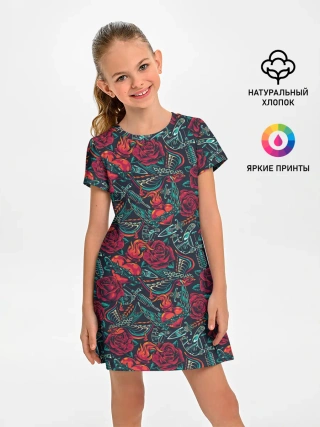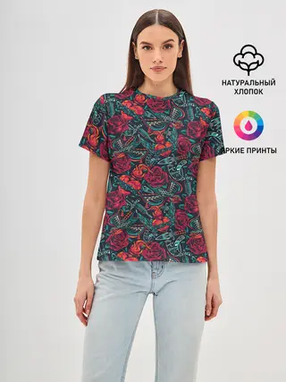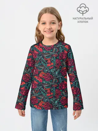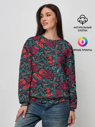 Лонгслив женский. Хлопок / Тату узор розы и машинки