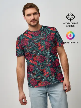 Мужская футболка оверсайз / Тату узор розы и машинки