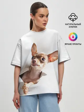 Женская футболка оверсайз / Чихуахуа из бумаги вылазит
