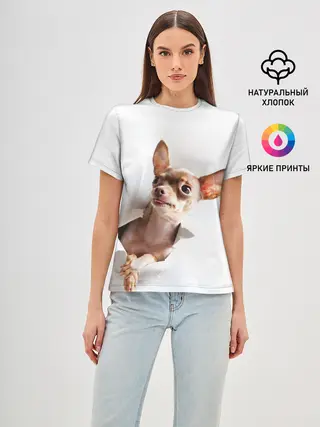 Женская базовая футболка / Чихуахуа из бумаги вылазит