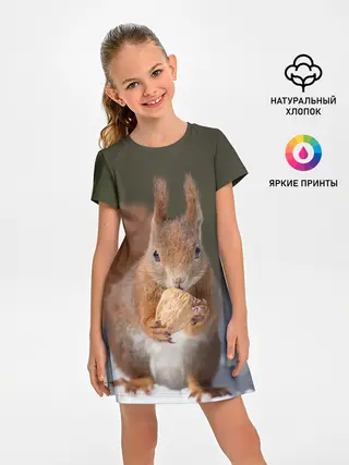 Детское платье / белка с орехом на снегу