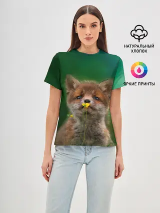 Женская базовая футболка / Лисенок нюхает цветок