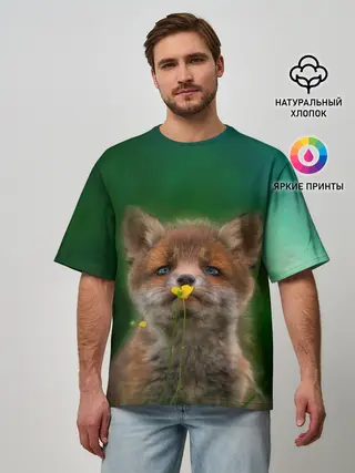 Мужская футболка оверсайз / Лисенок нюхает цветок