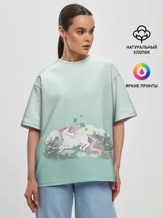Женская футболка оверсайз / единорог с бабочками