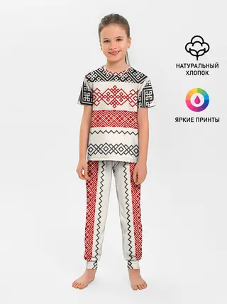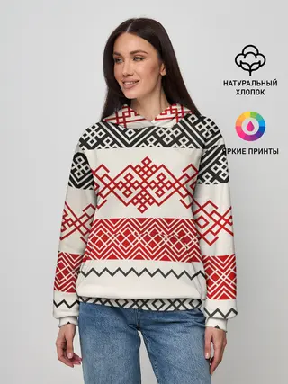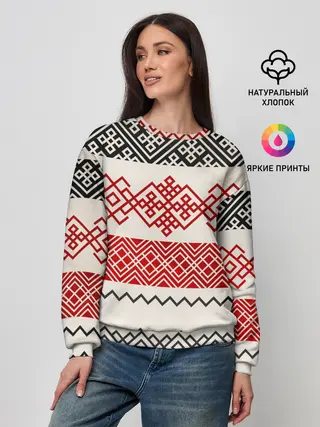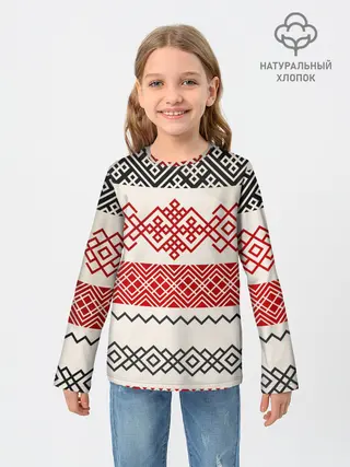 Лонгслив женский. Хлопок / Славянский узор красно-черный