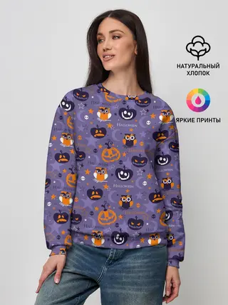 Лонгслив женский. Хлопок / Совушка и хэллоуин