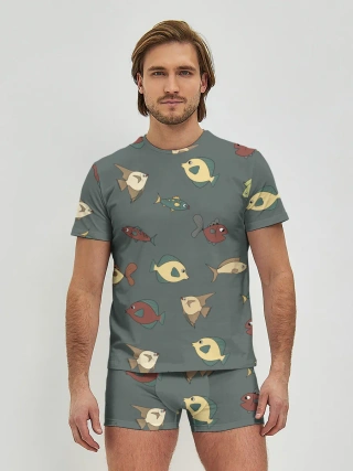Мужские трусы с футболкой / Морские рыбки на зеленом фоне