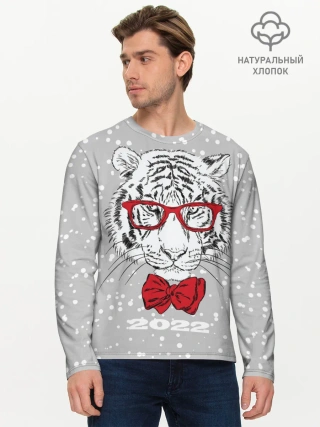 Мужской лонгслив базовый / Белый тигр с красным бантом