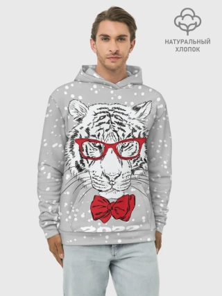 Худи мужской база хлопок / Белый тигр с красным бантом