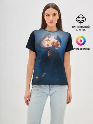 Женская базовая футболка / ТЫКВИННЫЙ МОНСТР В ТУМАНЕ / ХЕЛЛОУИН