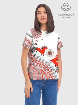 Женская базовая футболка хлопок / Мезенская роспись Horse