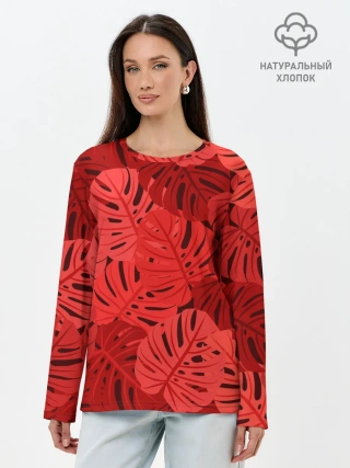 Лонгслив женский. Хлопок / Тропические листья Монстера