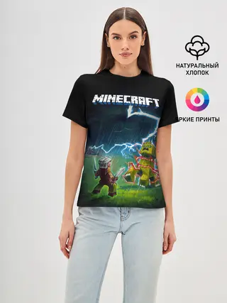 Женская базовая футболка / Бой Стива с Крипером под ударом молнии