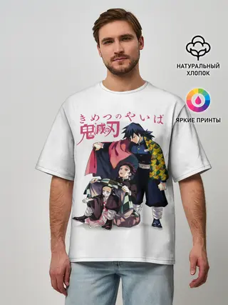 Мужская футболка оверсайз / Танджиро и Незуко под укрытием Гию