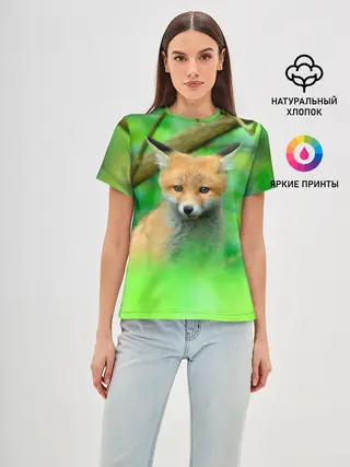 Женская футболка оверсайз / Лисенок в зеленом лесу