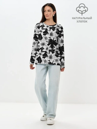 Лонгслив женский. Хлопок / Лилии черно-белые