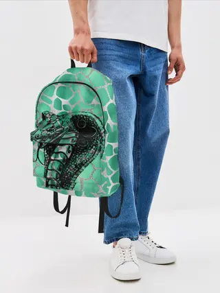 Рюкзак джинсовый / ЗМЕЯ НА КАМНЕ НА ЧЕРНОМ ФОНЕ