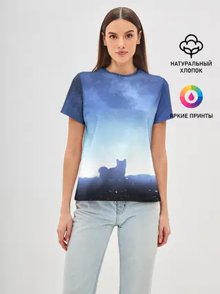 Женская футболка оверсайз / силуэт корги ночь космос дымка