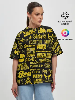 Женская футболка оверсайз / Логотипы рок групп GOLD