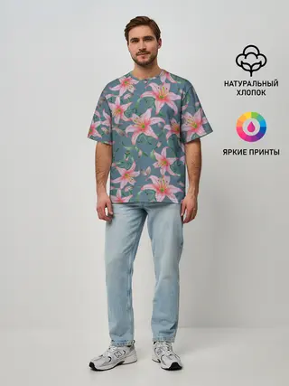 Мужская футболка оверсайз / Лилии на сером фоне