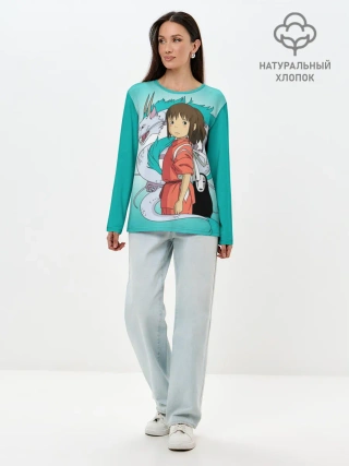Лонгслив женский. Хлопок / Тихиро и Хаку зеленый фон