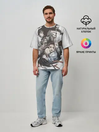 Мужская футболка оверсайз / Kimetsu no Yaiba на сером