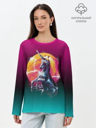 Лонгслив женский. Хлопок / РЕТРО ЕДИНОРОГ НЕОН