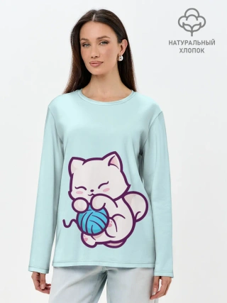 Лонгслив женский. Хлопок / Белый котенок с клубком милый