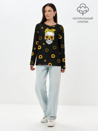 Лонгслив женский. Хлопок / Череп и подсолнухи