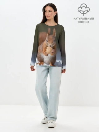 Лонгслив женский. Хлопок / белка с орехом на снегу