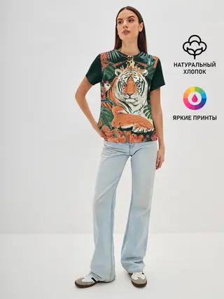 Женская футболка оверсайз / Огненный Тигр в Цветах