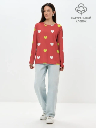 Лонгслив женский. Хлопок / Сердечки на красном паттерн