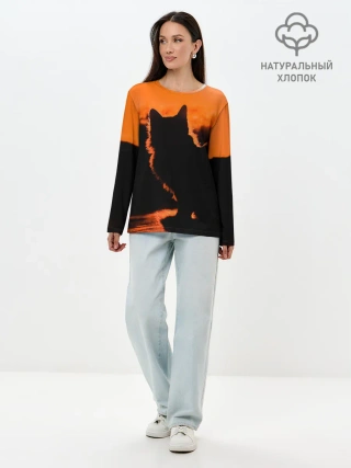 Лонгслив женский. Хлопок / Котенок на фоне заката