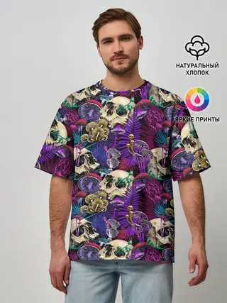 Мужская футболка оверсайз / Психоделика - черепа и грибы