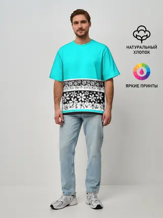 Мужская футболка оверсайз / Цветочный бирюзовый узор
